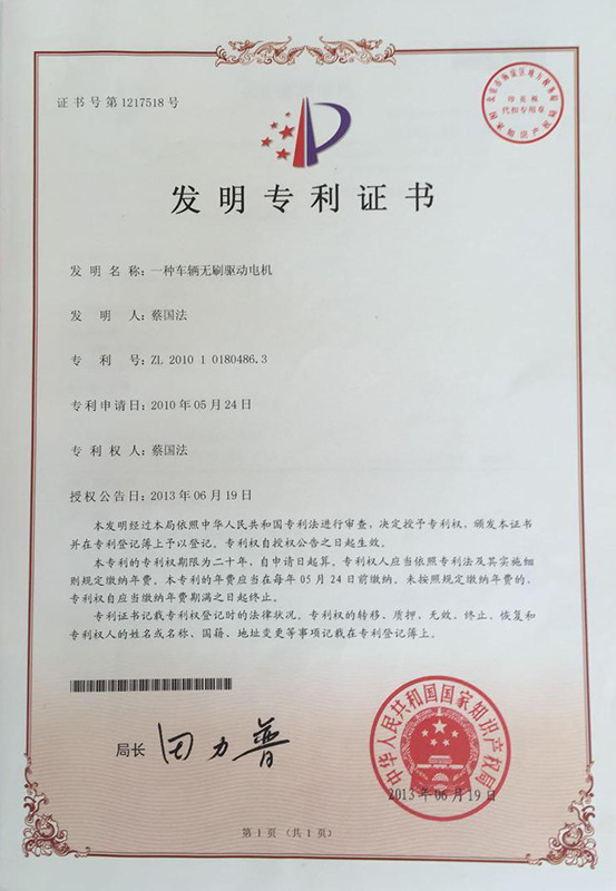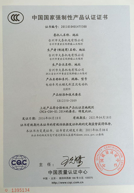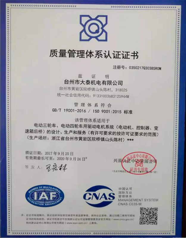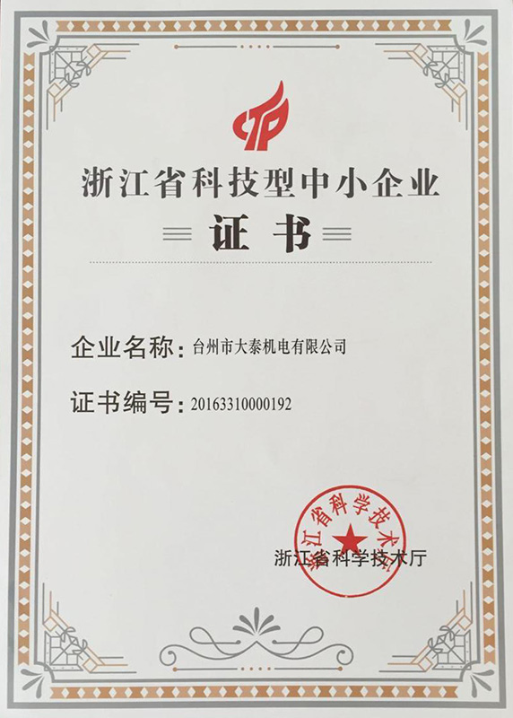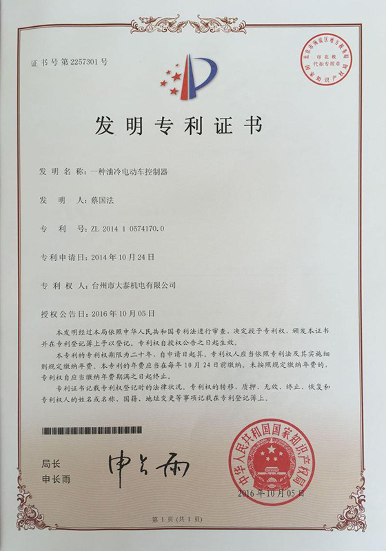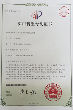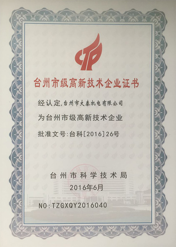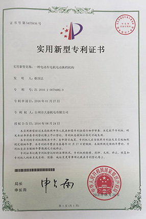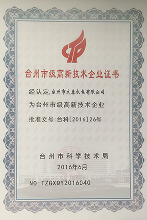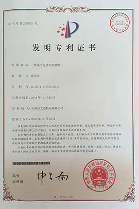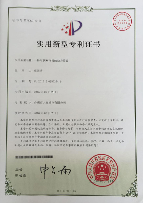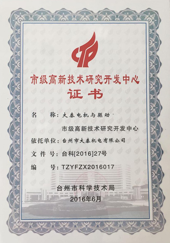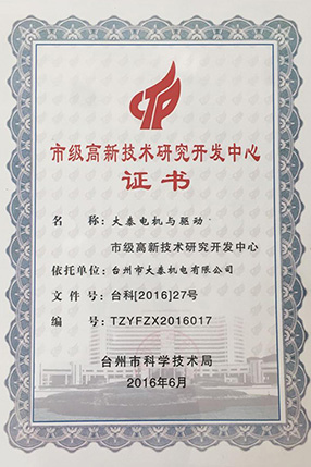 公司本着科技创新 质量为上的宗旨,以产品的设计研发为中心,拥有雄厚的技术开发团队。经过十多年的努力,从最早的直流无数永磁电机和控制器到不变档连体后桥驱动总成,再到两档变速后桥驱动总成,到现在的六相永磁同步电机(模块化)控制系统总成,国内大功率电动三轮车的3个发展阶段,见证了大泰电动力系统研发和技术创新给行业带来的重大改变。公司先后获得台州市首批瞪羚企业,黄岩区百强企业,安全生产标准化,发明专利4项,国家实用新型专利9项,外观专利4项等各项荣誉,公司产品一直深受国内外电动三轮车生产企业和终端消费者好评,大泰已成长为大功率电动车行业的标杆。